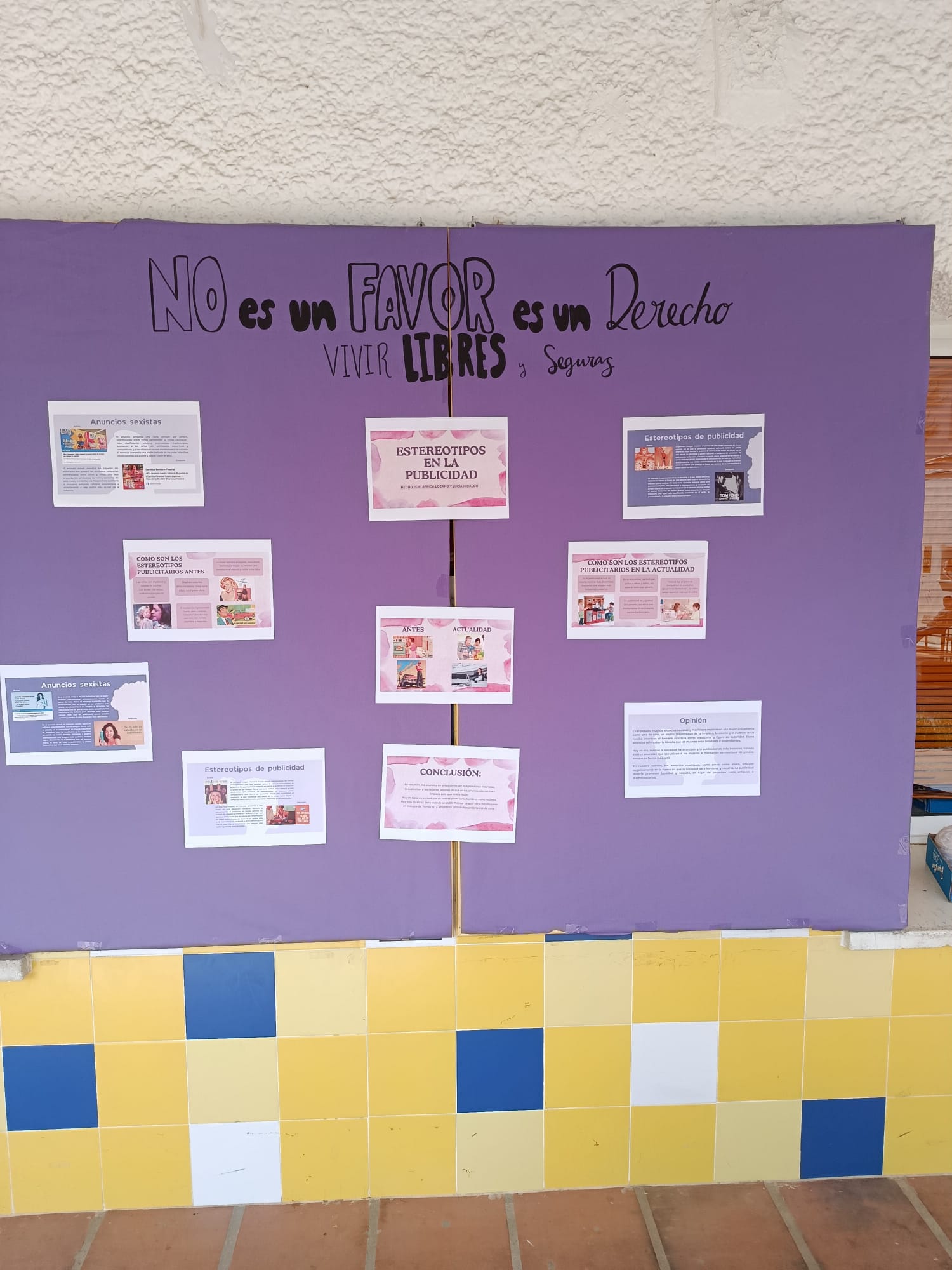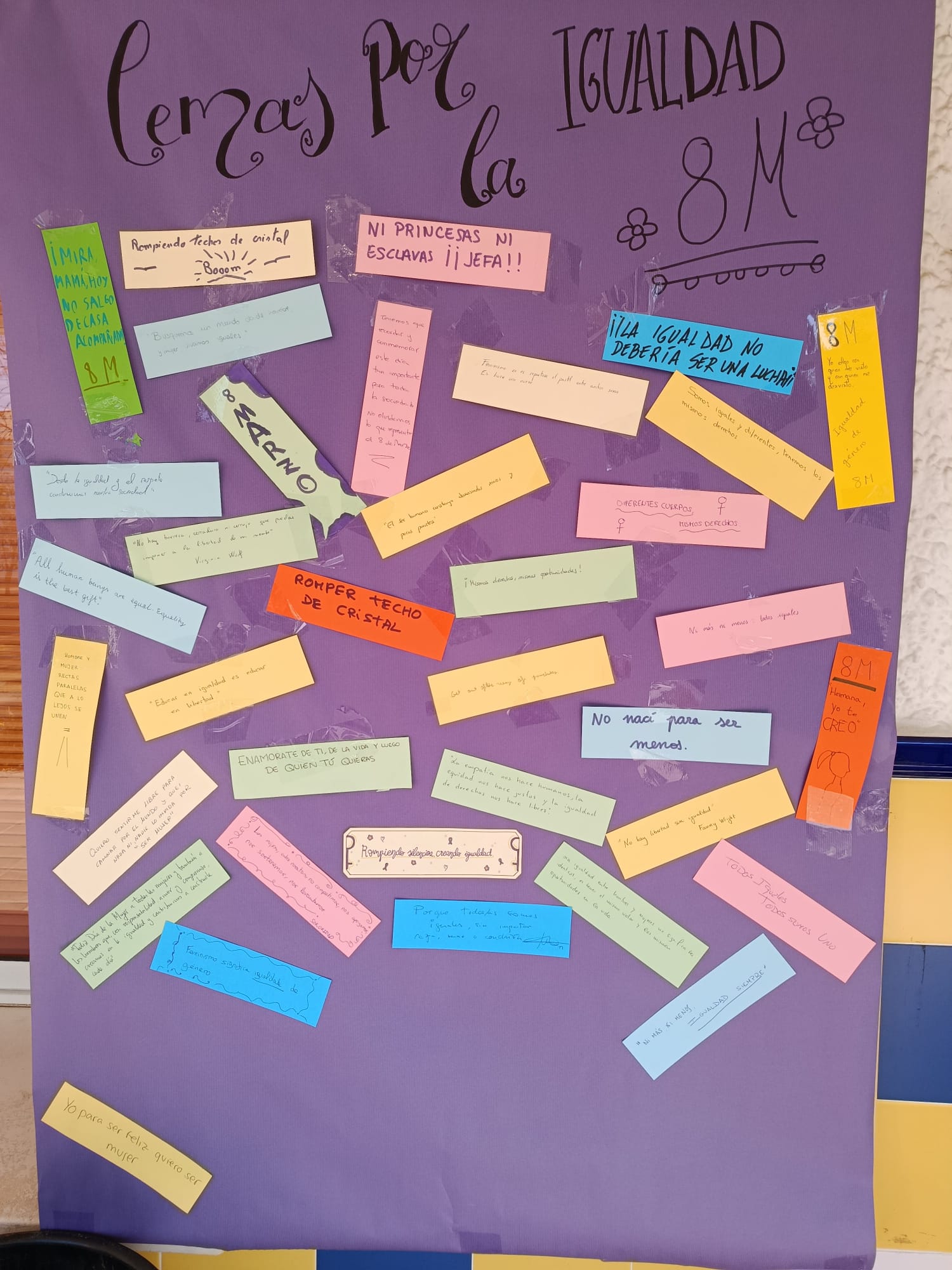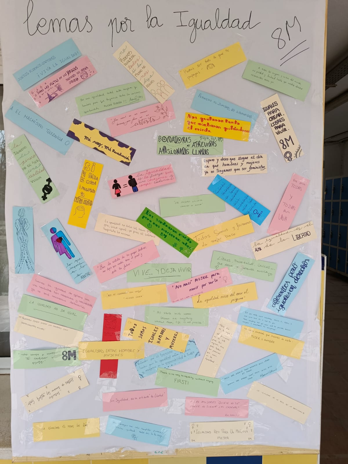 Por un lado, el trabajo de investigación del alumnado de 4ESO dirigido por la profesora Begoña Moreno con los siguientes temas: «Situación laboral de la Mujer en España y en diferentes países», «Evolución histórica de la situación laboral de la Mujer en España», «Estereotipos en la publicidad». Por otro lado, los lemas sobre Igualdad elaborados por diferentes sectores de la comunidad educativa en una actividad dinamizada por el grupo de Mediación en la que entregaban un bolígrafo con la inscripción «Soy feminista» a cambio del citado lema. Esta exposición será visitada por el alumnado como base de actividades de reflexión en diferentes materias.