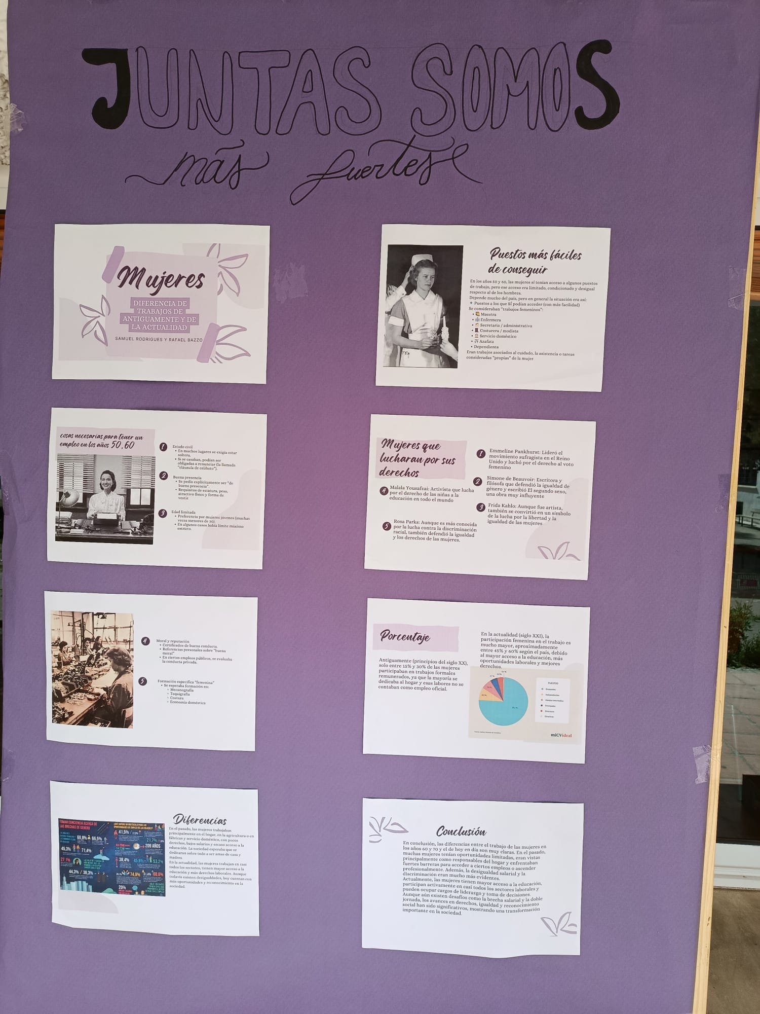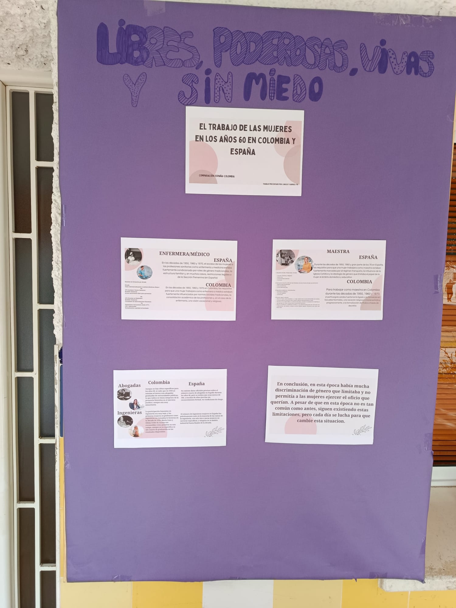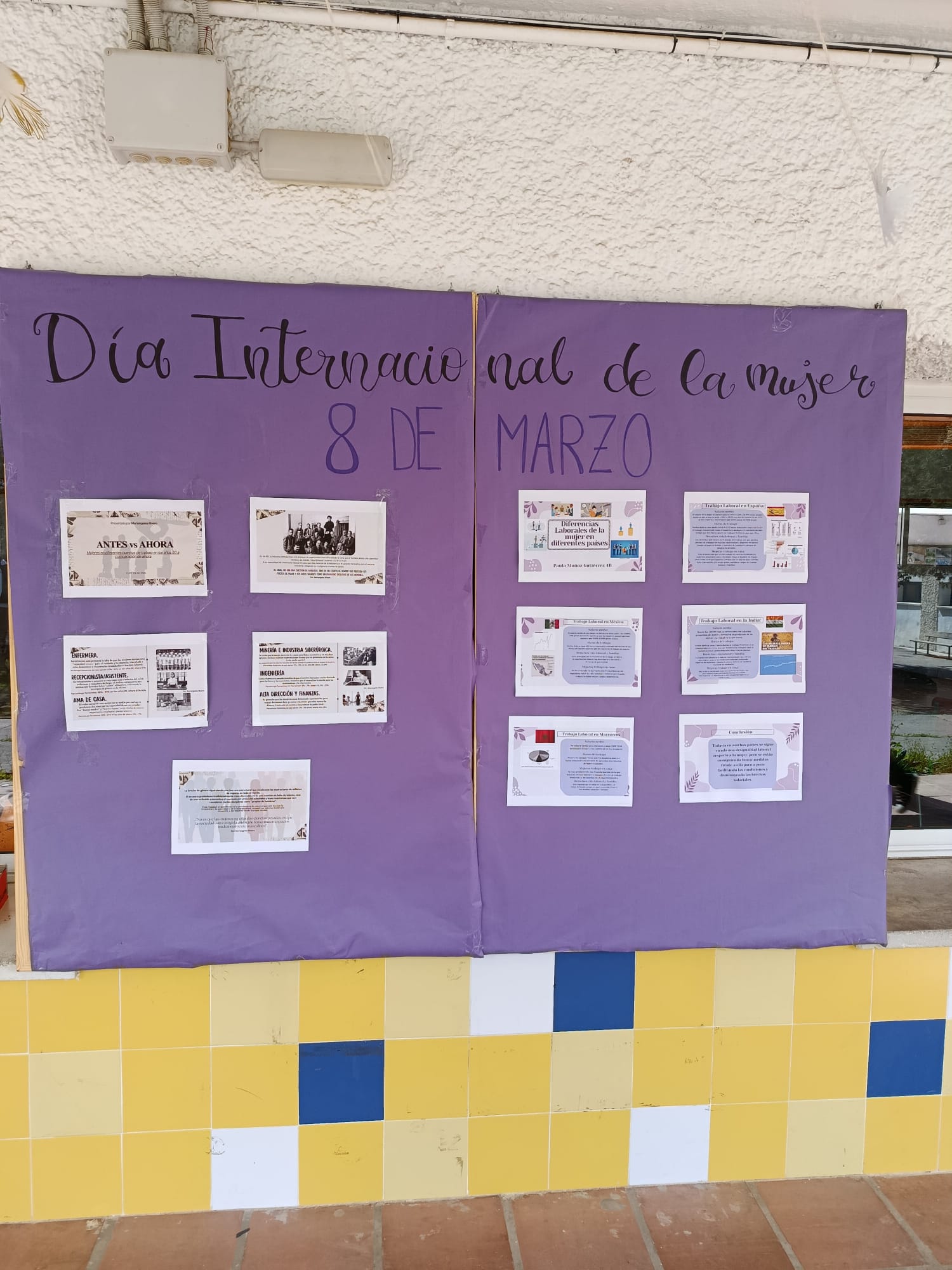 Por un lado, el trabajo de investigación del alumnado de 4ESO dirigido por la profesora Begoña Moreno con los siguientes temas: «Situación laboral de la Mujer en España y en diferentes países», «Evolución histórica de la situación laboral de la Mujer en España», «Estereotipos en la publicidad». Por otro lado, los lemas sobre Igualdad elaborados por diferentes sectores de la comunidad educativa en una actividad dinamizada por el grupo de Mediación en la que entregaban un bolígrafo con la inscripción «Soy feminista» a cambio del citado lema. Esta exposición será visitada por el alumnado como base de actividades de reflexión en diferentes materias.